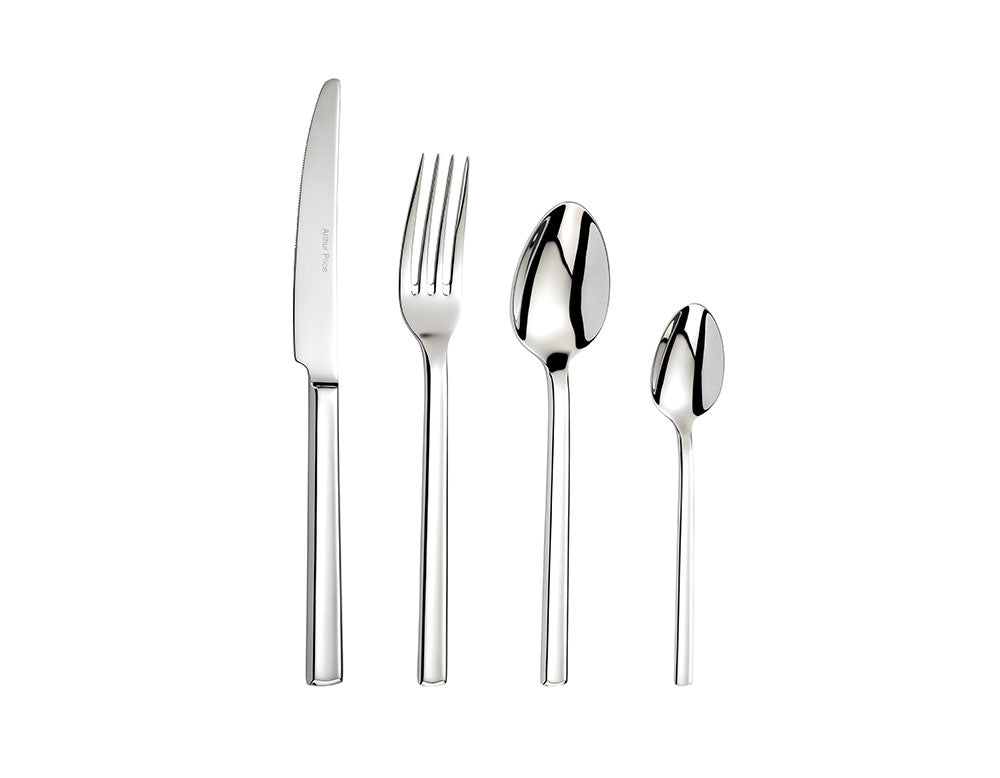 Coffret Horizon classique de tous les jours, 24 pièces. Comprend : 6 couteaux de table, 6 fourchettes de table, 6 cuillères à dessert et 6 cuillères à café. Détails : acier inoxydable 18/10, compatible lave-vaisselle et garantie 50 ans.
